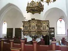 The carved altarpiece in the auricular style from 1656 is the work of Anders Mortensen from Odense. The central painting of the Last Supper (which contains an image of Nakskov Church in the background) is topped by depictions of the Crucifixion and Christ's removal from the cross. There are also figures of the Evangelists and the Apostles, Christ Resurrected and also of Moses and Aaron.[3][2] The pulpit, also in the Baroque auricular style, was completed by Jørgen Ringnis in 1630. It was presented to the church by Mayor Thyge Sørensen whose portrait, and that of his wife, have been included in the pulpit's decorations which also include the 12 apostles. Ringnis also designed the gallery (1631) with figures of the apostles which now stands below the organ loft.[4] The organ was built by Johan Lorentz in 1648 and restored in 1968. On that occasion, Paul-Gerhard Andersen took pains to restore the organ's Baroque housing by Søren Ibsen.[5]