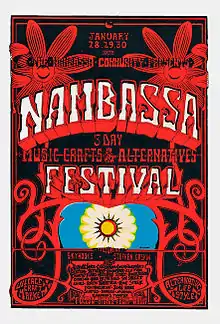Nambassa is also the tribal name of a charitable trust that has championed sustainable ideas and demonstrated practical counterculture ideals, a spiritually based alternative lifestyle, environmentalism and green issues from the early 1970s to the present.[1]