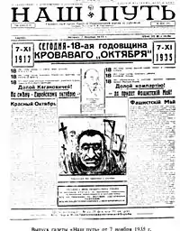 Nash Put (Russian: Наш Путь, Our Way) was a daily newspaper founded by Konstantin Rodzaevsky on 3 October 1933, that was issued in Harbin[1] (1933–41) and Shanghai (1941-1943). The newspaper was the official organ of the Russian Fascist Party. Nash Put' was published until July 1943.[2] The newspaper promoted Christian Orthodoxy, Russian ultranationalism and fascism. Estimated circulation was 4,000. The paper was edited by Konstantin Rodzaevsky from 1933 to 1943.[3] There was also a publishing house, "Izdatel'stvo gazety Nash Put'" (Russian: «Издательство газеты „Наш Путь“», "Publisher of the newspaper Our Way").[4] In 1936 it published Vladimir Kislitsin's memoirs In the fires of the Civil War: Memoires.