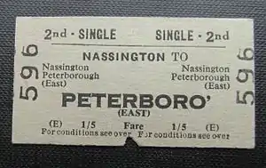 Nassington station closed to passengers on 1 July 1957, (at the same time as Wansford railway station and Castor railway station,the next two stations east towards Peterborough), and to goods on 3 August 1957.[4] The line remained open until the withdrawal of the passenger service from Rugby (Midland) to Peterborough (East) on 6 June 1966. On that date the section from Rugby (Midland) to King's Cliffe was closed completely, but the line east of King's Cliffe station remained open for goods traffic.[5] On 3 June 1968 King's Cliffe station was closed to goods along with the track as far as the junction with a private siding into the ironstone quarries owned by Naylor Benzon 1 kilometre (0.62 mi) west of Nassington station.[6] The last train to the quarry ran on 4 January 1971, and the siding and railway at Nassington finally closed on 26 February 1971.[7]