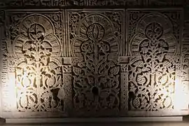 The area dedicated to al-Andalus is located in the 1st floor. Iconic pieces from al-Andalus include the pyxis of Zamora (actually made in Medina Azahara), the deer-like fountain source of Medina Azahara or the marble font for ablutions of Almanzor.[17] A Jewish bilingual chapitel from Toledo is also exhibited.[18] Two items of the so-called Alhambra vases stand out within the collection of Nasrid pottery.[19]