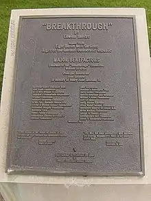One year after the fall of the Berlin Wall, Sandys unveiled Breakthrough before a crowd of 7,000 people gathered on the campus of Westminster College. Among the gathered crowd were former President Ronald Reagan, Senator John Ashcroft, and German Minister Plenipotentiary Fritjof von Nordenskjoeld.[11] The dedication of Breakthrough brought the Churchill Museum full-circle. Forty-four years after her grandfather had warned of the creation of the "iron curtain," Edwina Sandys' sculpture commemorated the close of the Cold War.