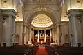The neoclassical church building was designed by John Russell Pope and completed in 1930.[8] The church is very large in size[9] and has a "monumental character" typical of Pope's style and seen in his other works, such as the Jefferson Memorial.[10] The church's design was partly influenced by James Gibbs' St Martin-in-the-Fields church, built at Trafalgar Square, London, in the early 18th century.[11] The building is built of Indiana limestone.[12] Scholar Thomas A. Tweed writes that the building's facade, "high on a terrace overlooking Thomas Circle, a prominent location in the city ... demands the attention of motorists and pedestrians."[13]