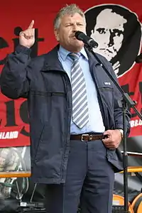 The party is mostly described as a neo-Nazi organization[16][17][18][5][19] and has been referred to as "the most significant neo-Nazi party to emerge after 1945".[6] The German Federal Agency for Civic Education, or BPB, has criticized the NPD for working with members of organizations which were later found unconstitutional by the federal courts and disbanded,[20][21] while the Federal Office for the Protection of the Constitution (German: Bundesamt für Verfassungsschutz), Germany's domestic security agency, classifies the NPD as a "threat to the constitutional order" because of its platform and ideology, and it is under their observation.[22] An effort to outlaw the party failed in 2003, because the government had many informers and agents in the party, some in high position, who had written part of the material used against them.[23] Since its founding in 1964, the NPD has never managed to win enough votes on the federal level to cross Germany's 5% minimum threshold for representation in the Bundestag; it has succeeded in crossing the 5% threshold and gaining representation in state parliaments 11 times, including one-convocation entry to seven West German state parliaments between November 1966 and April 1968 and two-convocation electoral success in two East German states of Saxony and Mecklenburg-Vorpommern between 2004 and 2011.[24] Since 2016, the NPD is again not represented in state parliaments. Udo Voigt led the NPD from 1996 to 2011.[22] He was succeeded by Holger Apfel,[25] who in turn was replaced by Udo Pastörs in December 2013. In November 2014, Pastörs was ousted and Frank Franz became the party's leader. Voigt was elected the party's first Member of the European Parliament in 2014. The party lost the seat in the 2019 European Parliament election.