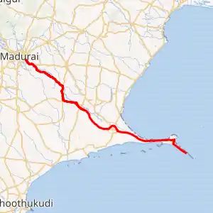 National Highway 87 (or NH 87) is a National Highway in southern India. It crosses the Pamban Bridge (Annai Indira Gandhi Bridge) before entering into Pamban Island. The total length runs up to 154 km (96 mi).[1] The 5 km road between Mukundarayar Chathiram and Dhanuskodi was destroyed during the 1964 cyclone. Then the Government of India has started construction of the new stretch of road on 2015 and opened to vehicles with some restrictions on Feb'2017 at a cost of ₹ 250 million. At the same time, the road between Madurai and Rameswaram was converted from a two lane road to a four-lane highway. Then Union minister for road transport and shipping Shri.Nitin Gadkari laid the foundation stone for the Rs 1,387-crore project in Madurai on 17 July 2015. An initial outlay of Rs 927 crore was made {May 2019} and the project has been sanctioned for Rs 1,387 crore. Then the first 75km stretch from Madurai to Paramakudi was proposed to be converted into a proper four-lane road which is a Green Highway, while the remaining 39km stretch from Paramakudi to Ramanathapuram was widened as a two-lane road with paved shoulders. This road includes bypass from Madurai (Viraganoor Ring road) to Manalur which is a newly constructed route skipping the old route(which runs through Puliyankulam and Silaiman), and has bypasses at several places like Thiruppuvanam, Thiruppachethi, Rajagambiram, Paramakudi (a 9.4-km-long stretch connecting Thelichathanallur and Vendhoni(near kalayur)) and Ramanathapuram (a nine-km-long bypass connecting Achunthanvayal and East Coast Road near Devipattinam) which would substantially ease traffic congestion in these towns and also saves time for those tourists who are going to Rameswaram. Falling under the Old NH-49, this project is one of the largest completed green corridor in Tamil Nadu by the National Highways Authority of India in the recent times.