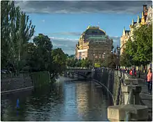 On 16 May 1868, the foundation stone was laid, and in November the foundations were completed. In 1875, the new building reached its full height and in 1877 the theatre was roofed over. As of 1873 there was an ongoing competition for the interior decoration of the building, the scenario of which had been elaborated by a special commission under the leadership of Sladkovský.[3] On the one hand, the themes were in the spirit of the Neo-Renaissance concept of a classic building.[4] On the other hand, they were inspired by the current enthusiasm for Slavonic mythology and the stories of the Manuscripts; both of these concepts were based on Josef Mánes' paintings and connected with the contemporary style of romantic landscape painting (also linked to Czech history). They provided the fundamental ideology guiding artistic expression, which today is described as the art of the generation of the National Theatre.