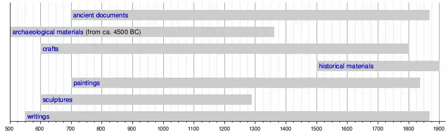 The designated items provide an overview of the history of Japanese art and architecture from ancient to modern times, with the earliest archaeological National Treasures dating back 6,500 years, and the Akasaka Palace dating from the early 20th century.[33][50][51][77] Items from any one of the categories of National Treasures may not represent the entire interval of time, but rather a shorter period of time determined by historical events, and coinciding with the time in which the specific artistry or type of architecture flourished.[28]
