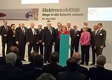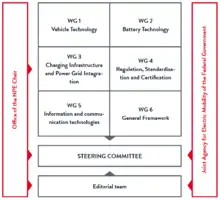 Subsequently, the involved partners committed to establish cross-company and cross-sector working groups and to deliver a first interim report until the end of 2010.[12] The coordination panels of the NPE could build on experts of the existing working groups of the German Commission for Electrical, Electronic & Information Technologies of DIN and VDE (DKE) of the Association for Electrical, Electronic and Information Technologies (VDE). The VDE Congress "E-mobility" on 8 and 9 December 2010 in Leipzig was used for technical consultation, from which the first interim report for the Federal Government has been derived. It describes the state of development and the expectations of the representatives of industry and research.[13]