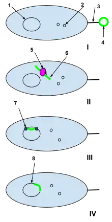 II: The foreign plasmid is transduced through the sex pili into the bacterial cell, where it is processed by bacterial cell restriction enzymes. The restriction enzymes break the foreign plasmid into a strand of nucleotides that can be added to the bacterial DNA.