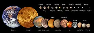 The following is a comparative table classifying the natural satellites in the Solar System by diameter. The column on the right includes some notable planets, dwarf planets, asteroids, and trans-Neptunian objects for comparison. The natural satellites of the planets are named after mythological figures. These are predominantly Greek, except for the Uranian natural satellites, which are named after Shakespearean characters. The nineteen bodies massive enough to have achieved hydrostatic equilibrium are in bold in the table below. Minor planets and satellites suspected but not proven to have achieved a hydrostatic equilibrium are italicized in the table below.