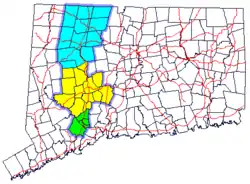Map of Connecticut showing the regions of the Naugatuck River Valley. Green is the Valley, yellow is the Greater Waterbury area, and blue is the Litchfield Hills region.
