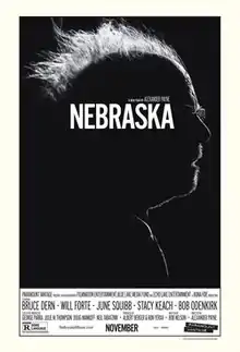 Nebraska is a 2013 American black-and-white comedy-drama road film written by Bob Nelson and directed by Alexander Payne.[4] It stars Bruce Dern, Will Forte, June Squibb, and Bob Odenkirk.[5] The film follows an elderly Montana resident and his son as they try to claim a million-dollar sweepstakes prize on a long trip to Nebraska.