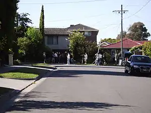 Pin Oak Court, in Vermont South, is the real cul-de-sac that doubles for Ramsay Street.[15][52] All of the houses featured in the show are real and the residents allow Neighbours to shoot external scenes in their front and back yards and on occasions, in their garages.[53] Neighbours has been filmed in Pin Oak Court since the series began in 1985 and it has since become popular with tourists. Tours to the cul-de-sac run throughout the year.[54] The interior scenes are filmed at the Global Television studios in Forest Hill, the adjoining suburb in which Pin Oak Court is located.[55][56]