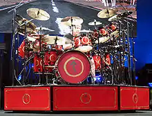 Peart played Zildjian A-series cymbals and Wuhan china cymbals until the early 2000s when he switched to Paragon, a line created for him by Sabian.[60][61] In concert starting in 1984 on the Grace Under Pressure Tour, Peart used an elaborate 360-degree drum kit that would rotate as he played different sections of the kit.[62]