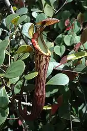 Lower pitchers have not been formally described,[3] although they are smaller and less frequently produced than their aerial counterparts.[10] Upper pitchers are narrowly infundibular, becoming slightly wider in the upper part. They reach over 30 cm in height.[10] In aerial pitchers, wings are usually reduced to a pair of ribs.[3] The waxy zone of the inner surface is well developed.[11] The pitcher mouth has an oblique insertion. The peristome is flattened, cylindrical in cross section, and up to 4 mm wide. The lid or operculum is orbicular and has a distinctive glandular crest on its underside. An unbranched spur is inserted near the base of the lid.[3]