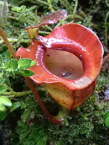 The unusually large glands on the underside of the lid produce copious amounts of nectar and likely lure insects into a precarious position over the pitcher mouth.[1]