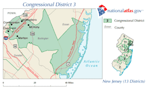 New Jersey's 3rd congressional district is represented by Democrat Andy Kim, who has served in Congress since 2019. The district combines nearly all of Burlington County with portions of the shore in Ocean County. Politically, it is closely divided, as Burlington leans Democratic and Ocean leans Republican.