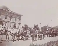 U.S. Cavalry at the Santa Fe Territorial Capitol dedication ceremony on June 4, 1900. The 1850 Territorial Courthouse building is at left.