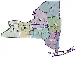 The NYSP divides New York state geographically into eleven "Troops," each comprising a specific geographic area, usually several counties. Each is supervised by a "Troop Commander" usually of the rank of Major.[10] NYSP Troops cover the following counties and regions as listed: