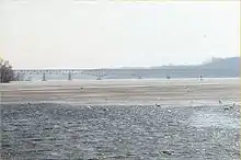 The first segment of an eastward extension of the Keeler Street Expressway, named the Irondequoit–Wayne County Expressway, opened c. 1971 between the Sea Breeze Expressway (at this point designated as part of NY 47) and Five Mile Line Road. In between, US 104 crossed Irondequoit Bay by way of the Irondequoit Bay Bridge.[45][48] US 104's former surface alignment between NY 47 and Five Mile Line Road was redesignated NY 404[45][49] while US 104 was temporarily realigned onto Five Mile Line Road between the expressway and Ridge Road to connect to its former alignment.[50]