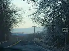 From this intersection NY 199 turns northeast again briefly, then east, into a landscape of rolling hills, farms and woodlots. Three miles (5 km) of long curves in a generally eastward direction, climbing slightly, it reaches another small hamlet, Pulvers Corners, at an intersection with County Route 59.[16] East of there, the road drops briefly into a swampy area, then climbs again as it turns southeast. At the North East town line, it reaches 1,000 feet (305 m) above sea level, the highest elevation along its route.[17] NY 199 continues southeast down a narrow valley for its last 2.3 miles (3.7 km) to its eastern terminus, at U.S. Route 44 and State Route 22 1.5 miles (2.4 km) southwest of Millerton.[18]