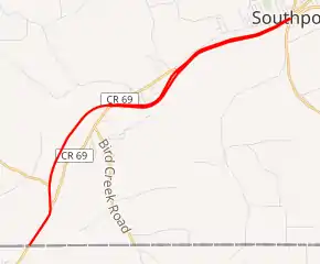 To the south, NY 328 was rerouted south of Seeley Creek c. 1935 to connect directly to PA 549, replacing NY 328A.[9][14] The former routing of NY 328 on Sagetown Road remained state maintained long after NY 328 had been realigned off of it.[15] The roadway was designated NY 960D, an unsigned reference route;[16] however, the route was turned over to the county by 1993 and is now CR 78.[17] In the 1960s, NY 328 was realigned between Seeley Creek and Southport to follow a new roadway built to bypass the hamlets of Seeley Creek, Webb Mills, and Pine City.[18][19][20] The realignment coincided with the designation of the route as part of Corridor U of the Appalachian Development Highway System in 1965.[21] The former alignment of NY 328 between Seeley Creek and Southport is now CR 69.[13][15]