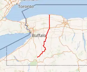 The segment of modern NY 98 between Varysburg and Batavia was originally designated as part of Route 19, an unsigned legislative route, by the New York State Legislature in 1908.[7][8] In the mid-1920s, what is now NY 98 between Batavia and modern NY 18 in Carlton was designated as NY 74.[9][10] The route was extended southward to Varysburg over the former routing of legislative Route 19 in the late 1920s.[11][12] In the 1930 renumbering of state highways in New York, NY 74 became part of NY 98, a new route that extended from Salamanca in the south to Carlton in the north via Great Valley, Franklinville, Arcade, and Varysburg.[2] When US 219 was extended into New York c. 1935,[13][14] it was routed on NY 98 between Salamanca and Great Valley.[15] The overlap between US 219 and NY 98 remained intact until c. 1962 when NY 98 was truncated on its southern end to Great Valley.[16][17]