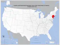 The U.S. Office of Management and Budget utilizes two definitions of the area: the metropolitan statistical area (MSA) and the combined statistical area (CSA). The MSA definition is titled the New York-Newark-Jersey City, NY-NJ-PA Metropolitan Statistical Area, and includes a population of 20.3 million people by 2017 Census estimates, roughly 1 in 16 Americans and nearly 7 million more than the second-place Los Angeles metropolitan area in the United States.[15] The MSA is further subdivided into four metropolitan divisions. The 23-county MSA includes 10 counties in New York State (coextensive with the five boroughs of New York, the two remaining counties of Long Island, and three counties in the Lower Hudson Valley); 12 counties in Northern and Central New Jersey; and one county in northeastern Pennsylvania. The largest urbanized area in the United States is at the heart of the metropolitan area, the New York–Newark, NY–NJ–CT Urbanized Area (estimated to have an area of 6,720 square miles).