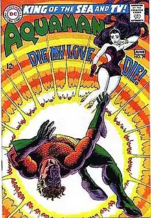 From 1962–1968, he drew the first 39 issues of Aquaman, whose character had previously starred in a backup feature in Adventure Comics, and all its covers through the final issue (#56, April 1971).[6] He recalled that, "Ramona Fradon had been drawing the character but was moving on for some reason. I remember being in [editor] Murray's [Boltinoff] office with Ramona during the transition. ... Anyway, they must have liked my work because when the character got his own series, they made me the artist".[11] Among the Aquaman stories which Cardy drew were issue #18 which featured the wedding of Aquaman and Mera[12] and #23 which saw the birth of the couple's son.[13] Aquagirl was introduced in issue #33 (June 1967) by Cardy and writer Bob Haney.[14]