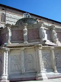 His last major commission was the Great Fountain at Perugia (1277–1278). The fountain with three superposed basins was designed by Fra Bevignate and Boninsegna. The fountain certainly shows the delicate hand of Nicolò Pisano, but most sculpting was executed by his son Giovanni Pisano and his assistants. By its richness in details and by its iconography, this last work shows a rapprochement to French Gothic art.