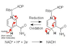 NAD+ acts as an electron carrier that helps with the interconversion of energy between nutrients and the cell's energy currency, adenosine triphosphate (ATP). In oxidation-reduction reactions, the active part of the cofactor is the nicotinamide. In NAD+, the nitrogen in the aromatic nicotinamide ring is covalently bonded to adenine dinucleotide. The formal charge on the nitrogen is stabilized by the shared electrons of the other carbon atoms in the aromatic ring. When a hydride atom is added onto NAD+ to form NADH, the molecule loses its aromaticity, and therefore a good amount of stability. This higher energy product later releases its energy with the release of a hydride, and in the case of the electron transport chain, it assists in forming adenosine triphosphate.[31]