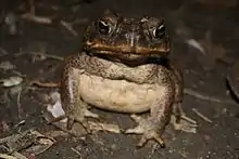 Two frog species are classified as endangered on the EPBC Act. One is the Fleay's barred frog (Mixophyes fleayi), a large frog of 90mm that relies on small streams in rainforest habitat.[25] The other is the giant barred frog (Mixophyes iteratus), a large frog up to 108mm with a powerful build.[26] There is an endangered species listed under the TSC Act called Loveridge's frog (Philoria loveridgei), a small ground-dwelling frog of 30mm in size. The pouched frog (Assa darlingtoni) and green-thighed frog (Litoria brevipalmata) are both listed as vulnerable under the TSC Act. All of these frogs are mainly threatened by the chytrid fungus.