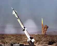 The first section of the Bell study was returned to the Army Ordnance department at the Redstone Arsenal on 2 December 1955. It considered the full range of threats including existing jet aircraft, future ramjet powered aircraft flying at up to 3,000 knots (5,600 km/h), short-range ballistic missiles of the V-2 type flying at about the same speed, and an ICBM reentry vehicle (RV) traveling at 14,000 knots (26,000 km/h).[6] They suggested that a missile with a common rocket booster could serve all of these roles by changing between two upper stages; one with fins for use in the atmosphere against aircraft, and another with vestigial fins and thrust vectoring for use above the atmosphere against missiles.[7]