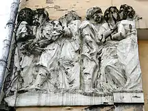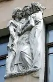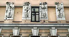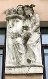 His use of sculpture has been linked to the legacy of Stroganov Institute school that focused on elaborate facade decorations.[3] However, none of contemporary architects used sculpture so frequently and on such scale as Zherikhov. His best known work, a small 4-story apartment building on the corner of Plotnikov and Maly Mogiltsevsky Lane, completed in 1907, features a band of 40 life-sized figures arranged in groups of two or three in explicitly erotic settings.[4] Three of the satyrs resemble Leo Tolstoy, Alexander Pushkin and Nikolay Gogol.[4] The name of the sculptor has been lost; perhaps it was Leeb Sinayev, author of Pushkin Museum friezes, or one of his disciples.[3] Tourist guides say that the building once housed a high-class brothel,[4] but the statement is refuted by historians as an urban legend.[3]