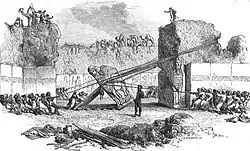 A member of ISIL filmed the destruction, declaring, "These ruins that are behind me, they are idols and statues that people in the past used to worship instead of Allah. The Prophet Muhammad took down idols with his bare hands when he went into Mecca. We were ordered by our prophet to take down idols and destroy them, and the companions of the prophet did this after this time, when they conquered countries."[41] ISIL declared an intention to destroy the restored city gates in Nineveh.[39] ISIL went on to do demolition work at the later Parthian ruined city of Hatra.[42][43] On April 12 2015, an on-line militant video purportedly showed ISIL militants hammering, bulldozing and ultimately using explosive to blow up parts of Nimrud.[44][45]
