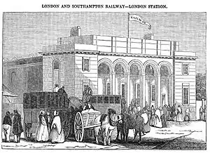 The station was closed to passengers from 11 July 1848 when the L&SWR opened its metropolitan extension, the Nine Elms to Waterloo Viaduct from Nine Elms to Waterloo (then called Waterloo Bridge Station), and the area adjacent to the station housed the L&SWR's carriage and wagon works until their relocation to Eastleigh in 1909.[2] After closure to passengers the station and surrounding tracks continued in use for goods traffic.