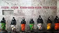 The consort of Ninra Narayana, Aruna Mahadevi (also called "Shenbagavalli") has a separate shrine in the second tier. The Utsavar (festival image) of Arunakamala Mahadevi is called Shenbagavalli and is housed inside the same shrine. Unlike other temples, the image of Thayar is seen in standing posture. All poojas are first performed to Thayar before being done for the presiding deity. The second tier houses the four-pillared hall, vehicle hall and mirror room. A cave temple on the lower tier, bearing the traces of Pandyan art, is located to the West of Kalyana Mandap. The image of Pallikonda Perumal is housed in the cave, with Sridevi and Bhudevi serving his feet and sages Markandeya and Bhrigu occupying prominent places on either side.[1] The rectangular walls around the temple enclose all the shrines and water bodies associated with the temple. The rajagopuram, the main gateway tower, has a flat structure, compared to other South Indian temples that have a steep structure.[1]