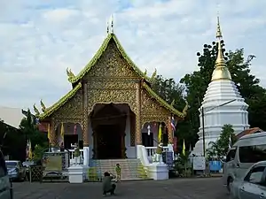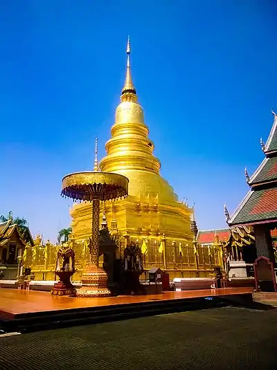 Nirat Hariphunchai (Thai: โคลงนิราศหริภุญชัย, Khlong nirat hariphunchai) is an old poem of around 720 lines, originally composed in Northern Thai language. Nirat, derived from a Sanskrit word meaning “without”, is a genre of Thai poetry that involves travel and love-longing for a separated beloved.[1] Hariphunchai (Pali: Haribhuñjaya) was an ancient kingdom, centered at Lamphun, incorporated into the Lan Na kingdom by Mangrai in the late 13th century. The poem recounts a journey from Chiang Mai to Lamphun to venerate the Buddhist reliquary, Wat Phra That Hariphunchai, with visits to around twenty temples and shrines along the way. During the journey, the author laments his separation from his beloved Si Thip. The journey takes two or three days. The poem ends at a festival in the reliquary, attended by a queen and her son. The original may date to 1517/18 CE. The poem was little appreciated until recently owing to the difficulty of the old language.