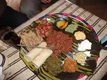 ![]() Kitfo is a minced raw beef dish that incorporates niter kibbeh and a spice blend (mitmita). | |