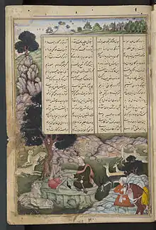 A story of pre-Islamic[29] Persian origin which is found in the great epico-historical poems of Shahnameh and is based on a true story that was further romanticized by Persian poets.[44] The story chosen by Nezami, was commissioned and dedicated to the Seljuk Sultan Toghril II, the Atabek Muhammad ibn Eldiguz Jahan Pahlavan and his brother Qizil Arslan. It contains about 6,500 distichs in length, the story depicts the love of Sassanian Khosrow II Parviz towards his Armenian[45] princess Shirin. "Khusrow and Shirin" recounts the story of King Khosrow's courtship of Princess Shirin, and vanquishing of his love-rival, Farhad.[46] The story has a complex structure with several genres exploited simultaneously; and contains many verbal exchanges and letters, all imbued with lyrical intensity.[11] Khosrow endures long journeys, physical and spiritual, before returning to Shirin, his true love.[11] They are eventually married, but eventually Khosrow is killed by his son and Shirin commits suicide over the body of her murdered husband.[11] Pure and selfless love is represented here embodied in the figure of Farhad, secretly in love with Shirin, who finally falls victim to the king's ire and jealousy.[11]
