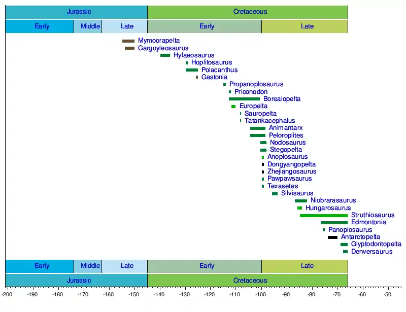 Below is a table showing the age difference between continents. North American nodosaurids are teal, European nodosaurids are green, European polacanthids are blue, and North American polacanthids are brown. Other nodosaurids or polacanthids are black. This table supports the observations by Kirkland et al. (2013).[3]