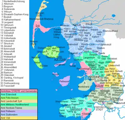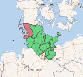 Nordfriesland (Danish: Nordfrisland, English: North Frisia, North Frisian: Nordfraschlönj) is the northernmost district of Germany, part of the state of Schleswig-Holstein. It includes almost all of traditional North Frisia along with adjacent areas to the east and south and is bound by (from the east and clockwise) the districts of Schleswig-Flensburg and Dithmarschen, the North Sea and the Danish county of South Jutland. The district is called Kreis Nordfriesland in German, Kreis Noordfreesland in Low German, Kris Nordfraschlönj in Mooring North Frisian, Kreis Nuurdfresklun in Fering North Frisian and Nordfrislands amt in Danish.