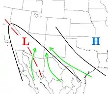 The monsoon begins in late May to early June in southern Mexico and spreads along the western slopes of the Sierra Madre Occidental, reaching Arizona and New Mexico in early July. It extends into the southwest United States as it matures in mid-July, when an area of high pressure, called the monsoon or subtropical ridge, develops in the upper atmosphere over the Four Corners region, creating wind flow aloft from the east or southeast. At the same time, a thermal low (a trough of low pressure from intense surface heating) develops over the Mexican Plateau and the Desert Southwest of the United States.[4] However, the near constant presence of the hot and very dry continental tropical (cT) airmass, means that a strong dewpoint frontal boundary, the dryline, becomes prevalent. The cT airmass lies on the northwest side of this front. On the southeast side of this boundary, is the warm, humid maritime tropical (mT) airmass that arrives upon the dryline crossing over advancing towards the northwest. When this occurs, it signals the meteorological start to the monsoon period. There are also quieter periods at times, when the dryline retrogrades somewhat back to the southeast, temporarily returning low level continental air and its much lower precipitable water levels to the affected areas, when the monsoon flow tendency periodically slackens.