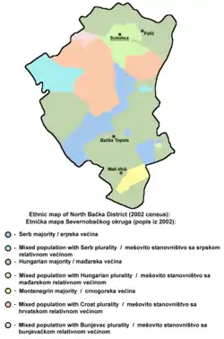 The North Bačka District (Serbian: Севернобачки округ / Severnobački okrug pronounced [sêʋeːrnobâːtʃkiː ôkruːɡ]; Hungarian: Észak-bácskai körzet) is one of seven administrative districts of the autonomous province of Vojvodina, Serbia. It lies in the Bačka geographical region. According to the 2011 census results, it has a population of 186,906 inhabitants. The administrative center of the district is the city of Subotica.