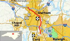 North Carolina Highway 147 (NC 147) is a North Carolina state highway. The route is a 15.7-mile-long (25.3 km) freeway that connects the Research Triangle Park (RTP) to both Western Wake County and the city of Durham. The section north of Interstate 40 (I-40) is known as the Durham Freeway, while the section south of I-40 is part of the Triangle Expressway.