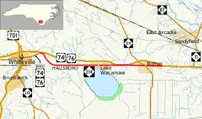 NC 214 begins at an intersection with Business U.S. Routes US 74 Business and US 76 Business about 1 1⁄2 miles (2.4 km) east of Whiteville. The intersection is located just south of exit 244 on US 74/US 76. The two-lane road heads southeast then due east through a rural area until reaching the communities of Hallsboro and Artesia. NC 214 heads north of Lake Waccamaw. Though the road never strays more than 1 mile (1.6 km) from the US 74/US 76 freeway throughout its entire length, the freeway dips south to cross the Friar Swamp/Green Swamp immediately adjacent to the lanes of NC 214. After heading through the town of Bolton where it intersects NC 211, the road briefly widens from a two-lane road to a four-lane divided highway but soon ends at an intersection with US 74/US 76 1 mile (1.6 km) east of the town.[1]