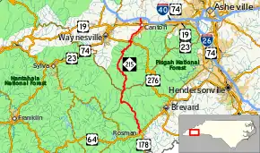 North Carolina Highway 215 (NC 215) is a highway in western North Carolina that runs from the town of Rosman in Transylvania County to Canton at Interstate 40 and U.S. Route 74 (US 74). The portion from Canton to Rosman is a part of the US Forest Service's Forest Heritage Scenic Byway. It travels high into the mountains along a scenic stretch of the upper West Fork of the Pigeon River, and intersects the Blue Ridge Parkway at Beech Gap at an elevation of approximately 5,300 feet (1,600 m).