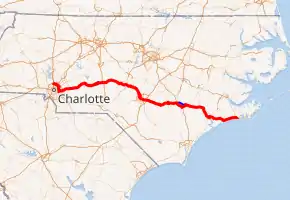 NC 24 is both one of the longest and most concurrent routes in the state. Besides the approximately 100-mile (160 km) concurrency with NC 27 between Johnsonville and Charlotte, this route also shares long stretches of pavement with: