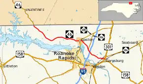 North Carolina Highway 46 (NC 46) is a primary state highway in the U.S. state of North Carolina; it is entirely in Northampton County. The route primarily connects the communities on the north side of Roanoke Rapids Lake and Lake Gaston, as well as the north side of the Roanoke River in the county.