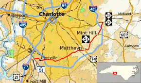 Though NC 51 begins at the state line, SC 51 is a short 1-mile-long (1.6 km) road that connects with US 21, near Fort Mill, South Carolina. Crossing the state line, NC 51 quickly becomes a four-lane road as it goes through the town of Pineville. After its first intersection with I-485, it enters the Charlotte city limits. In Charlotte, NC 51 crosses the busy intersections of Johnston Road and Providence Road, known for rush-hour traffic during the weekdays. In Matthews, NC 51 bypasses the main downtown area, followed by a semi-controlled interchanged with US 74 (Independence Boulevard). As the NC 51 enters Mint Hill, the road narrows to two-lane. NC 51 crosses intersects I-485 again, before ending at NC 24/NC 27 (Albemarle Road).[2][1]